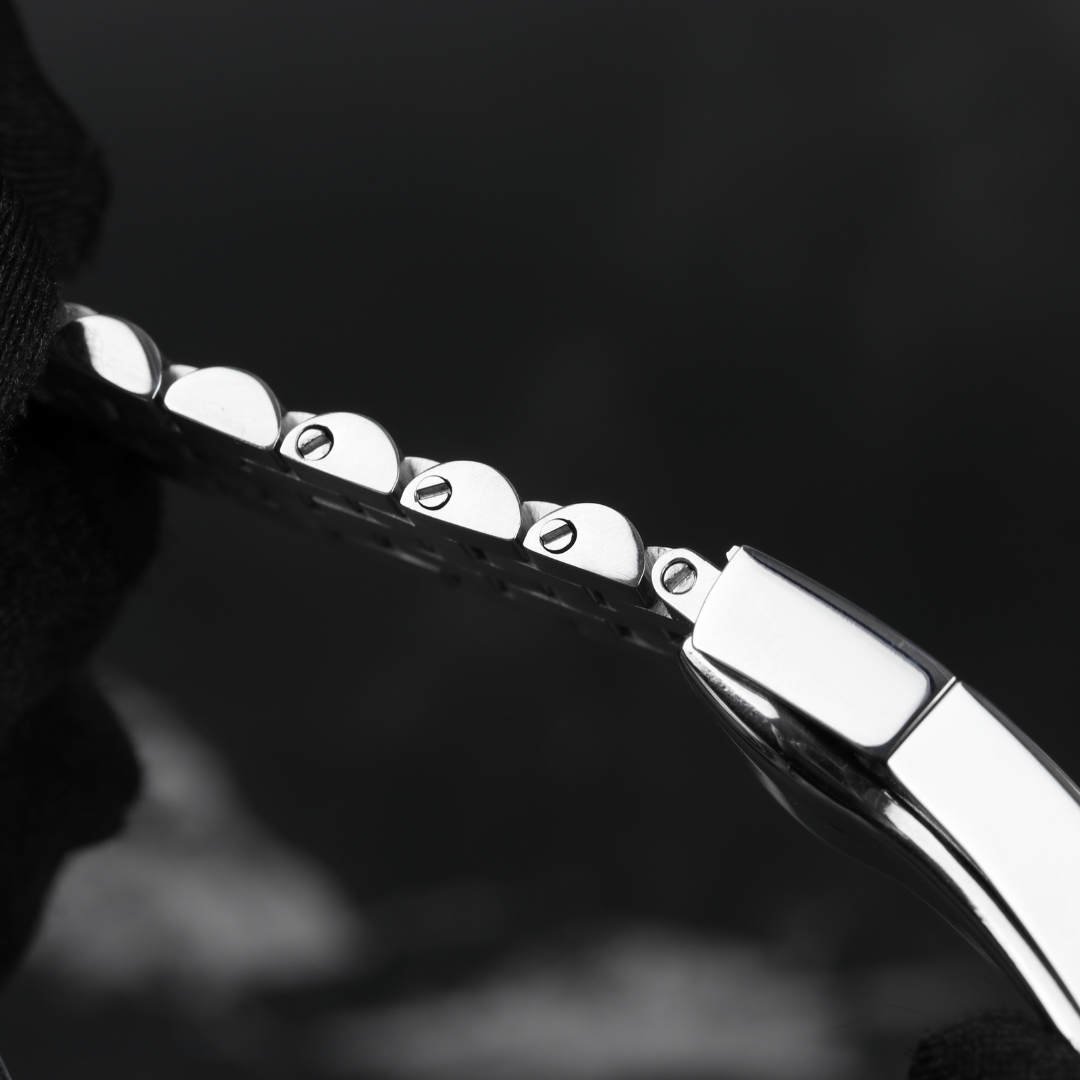 The bracelet features removable links and a quick-adjust clasp, giving you a perfect fit straight out of the box. Paired with a screw-down crown, this watch offers enhanced water resistance and everyday reliability.
