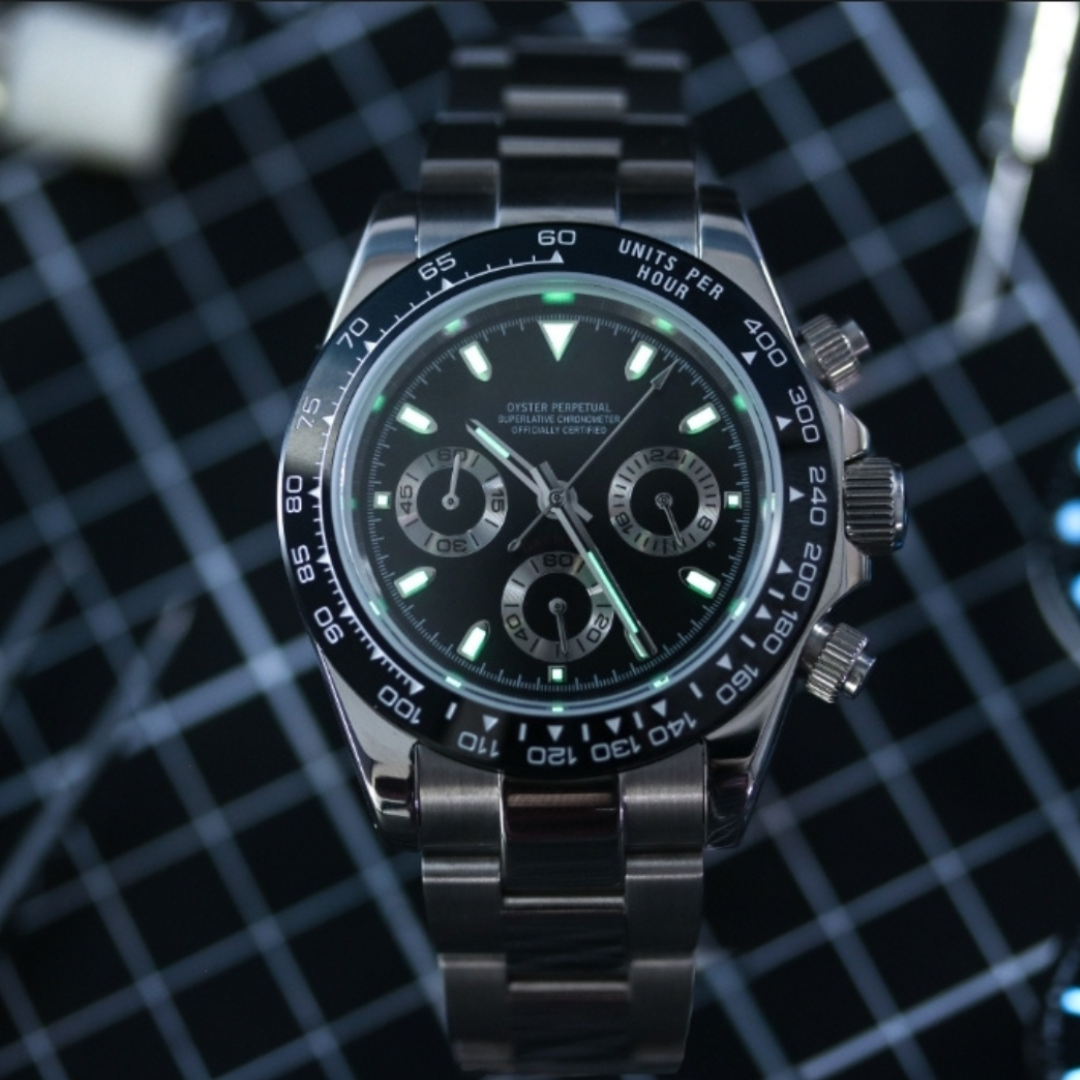 The bracelet features removable links and a micro-adjustment clasp, giving you a perfect fit straight out of the box. Featuring a polished black ceramic bezel, luminous hands, and a scratch-resistant sapphire crystal, this timepiece blends classic chronograph styling with rugged performance.